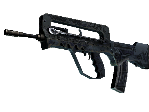 A cheap option for cash-strapped players, the FAMAS effectively fills the niche between more expensive rifles and the less-effective SMGs. It has been spray-painted with a Norse inspired pattern of interlocking blue rings.