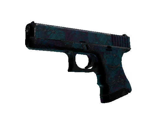 The Glock 18 is a serviceable first-round pistol that works best against unarmored opponents and is capable of firing three-round bursts. A teal and purple hydrographic pattern of overlapping leaves has been applied.