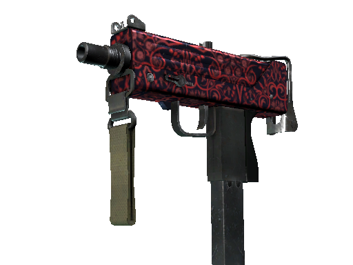 Essentially a box that bullets come out of, the MAC-10 SMG boasts a high rate of fire, with poor spread accuracy and high recoil as trade-offs. A red millefleur hydrographic has been applied.